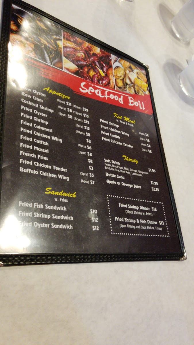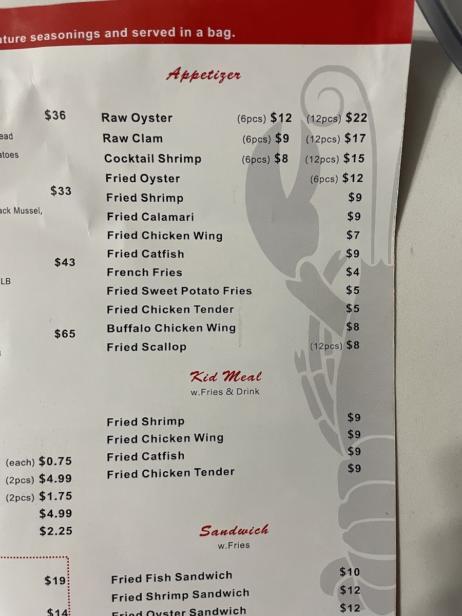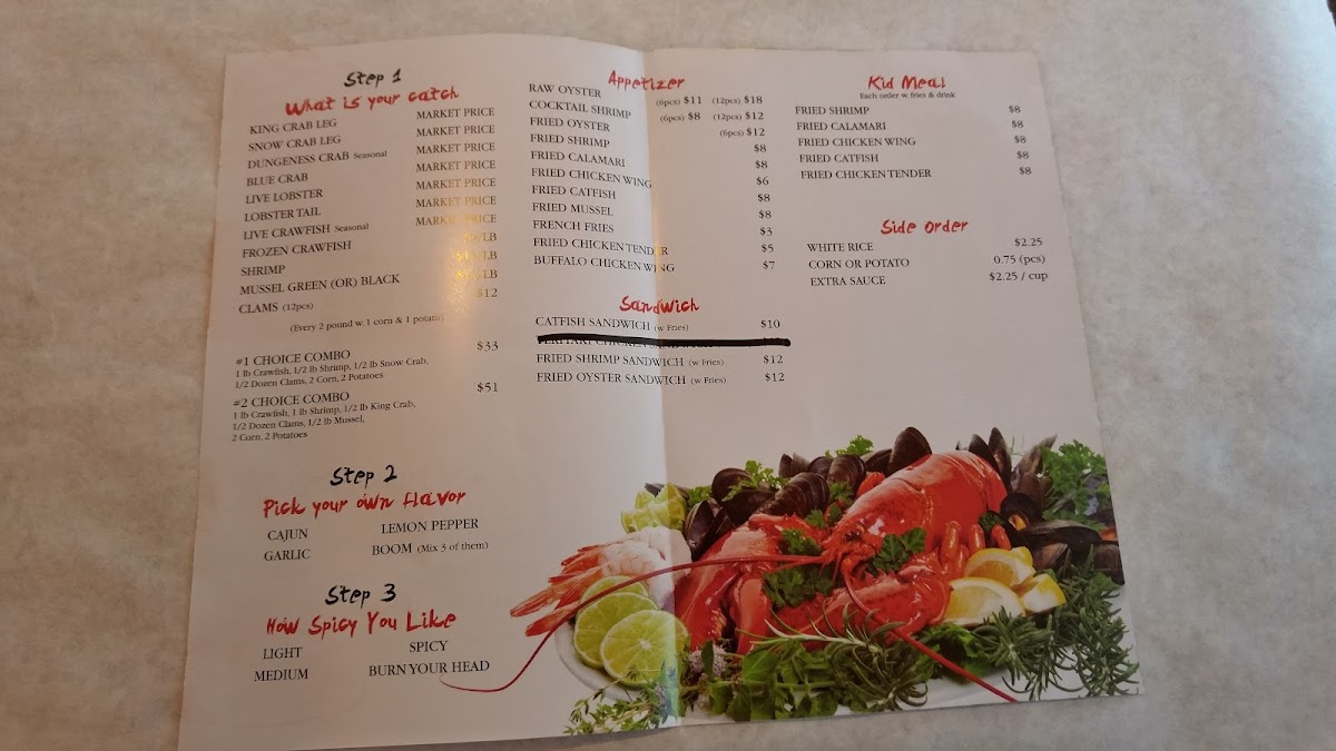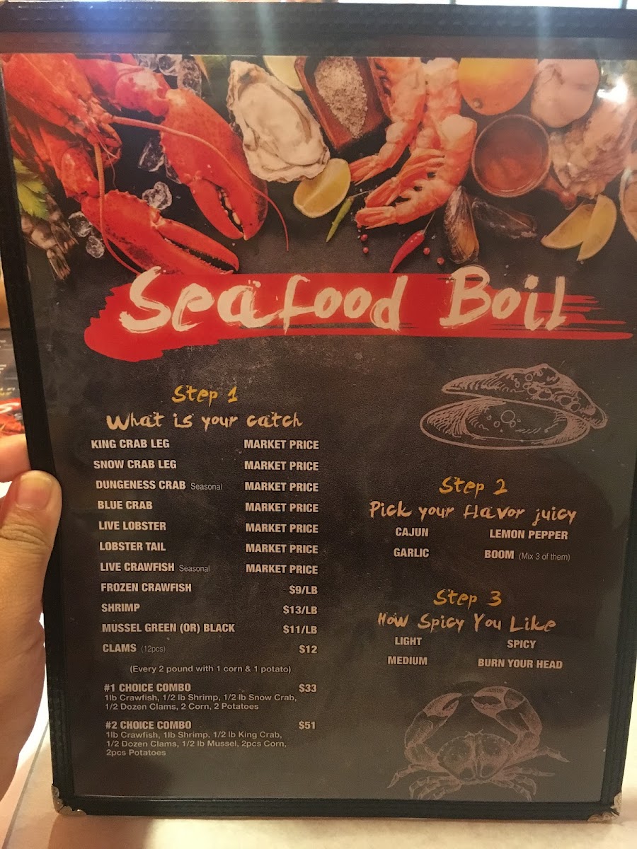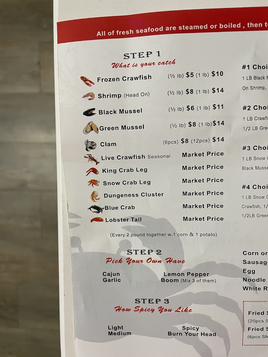 1/2lb frozen crawfish with choice of spicy level: light to "burn your head". Flavors include Cajun, lemon pepper, garlic, or "boom" mix sauce, available in-bag or extra on the side.