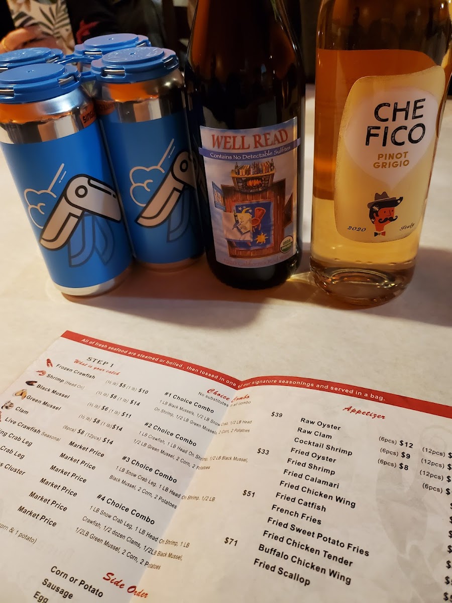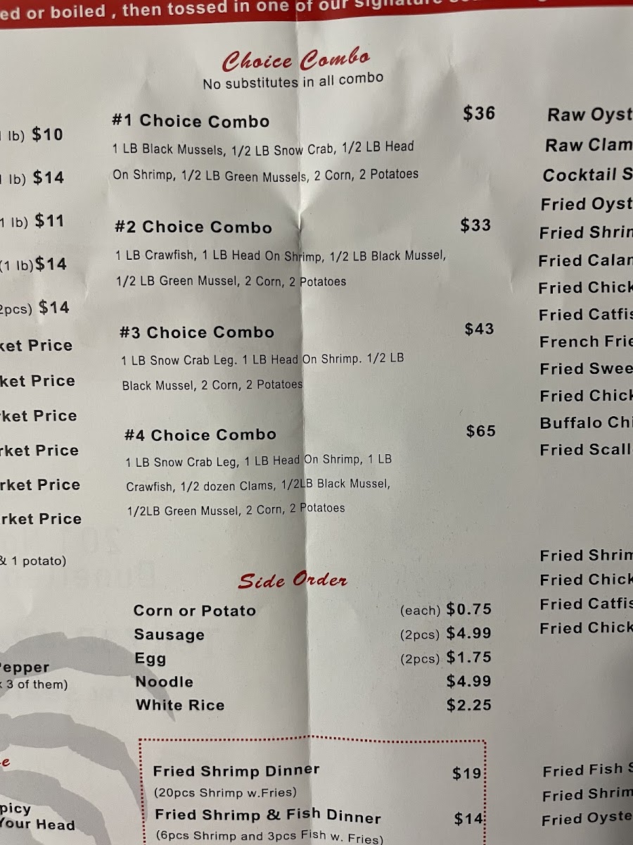 1lb snow crab leg, 1lb head on shrimp, 1/2lb black mussel 2corn, 2 potatoes Shrimp not Deveined