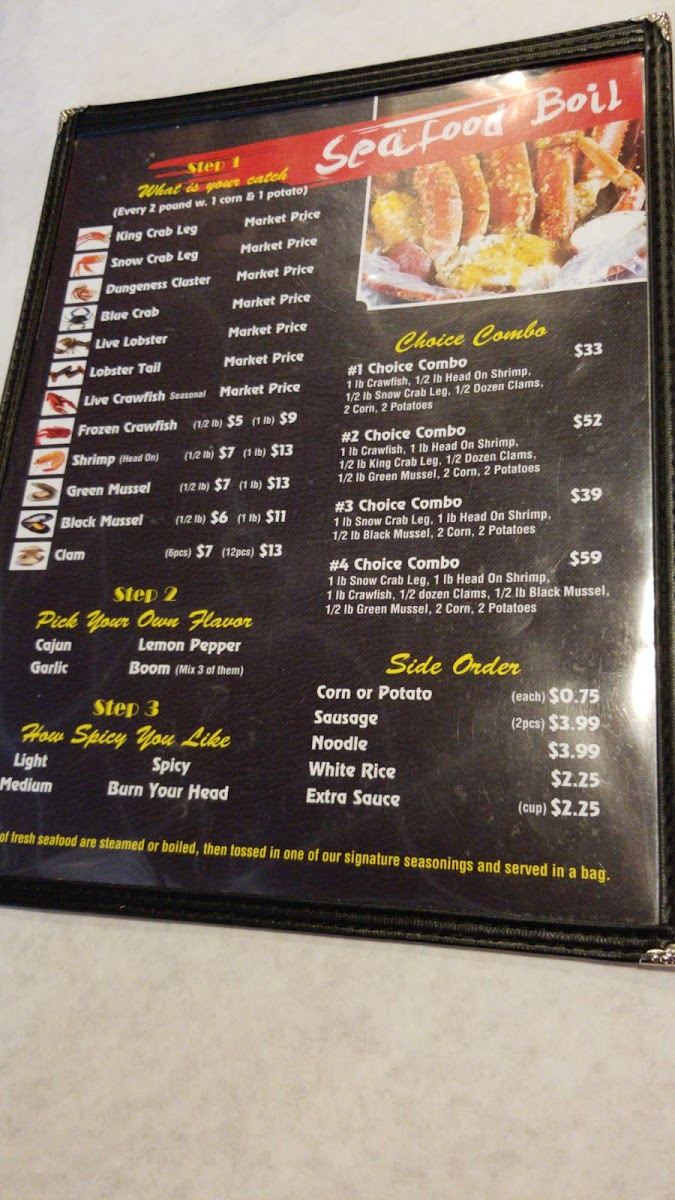 1/2lb snow crab legs with choice of spicy level from light to "burn your head". Option of Cajun, lemon pepper, garlic, or "boom" sauce, each either in the bag or extra on the side.