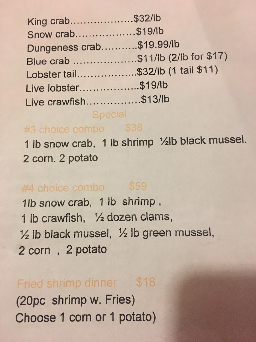 1lb snow crab leg, 1lb head on shrimp, 1lb crawfish, 1/2dozen clams, 1/2lb black mussel, 1/2lb green mussel, 2 corn,2 potatoes Shrimp Not Deveined